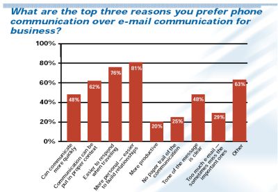 The survey also indirectly pointed out some of the shortcomings of e-mail. The top three reasons why respondents choose the phone over e-mail are that the phone is more personal, it creates better context for communication, and it helps clarify the tone of messages. These findings suggest that e-mail is sometimes seen as impersonal and prone to misunderstanding, because verbal cues and context are missing.